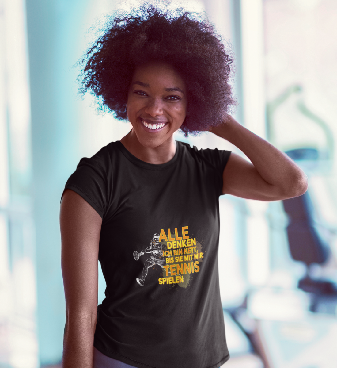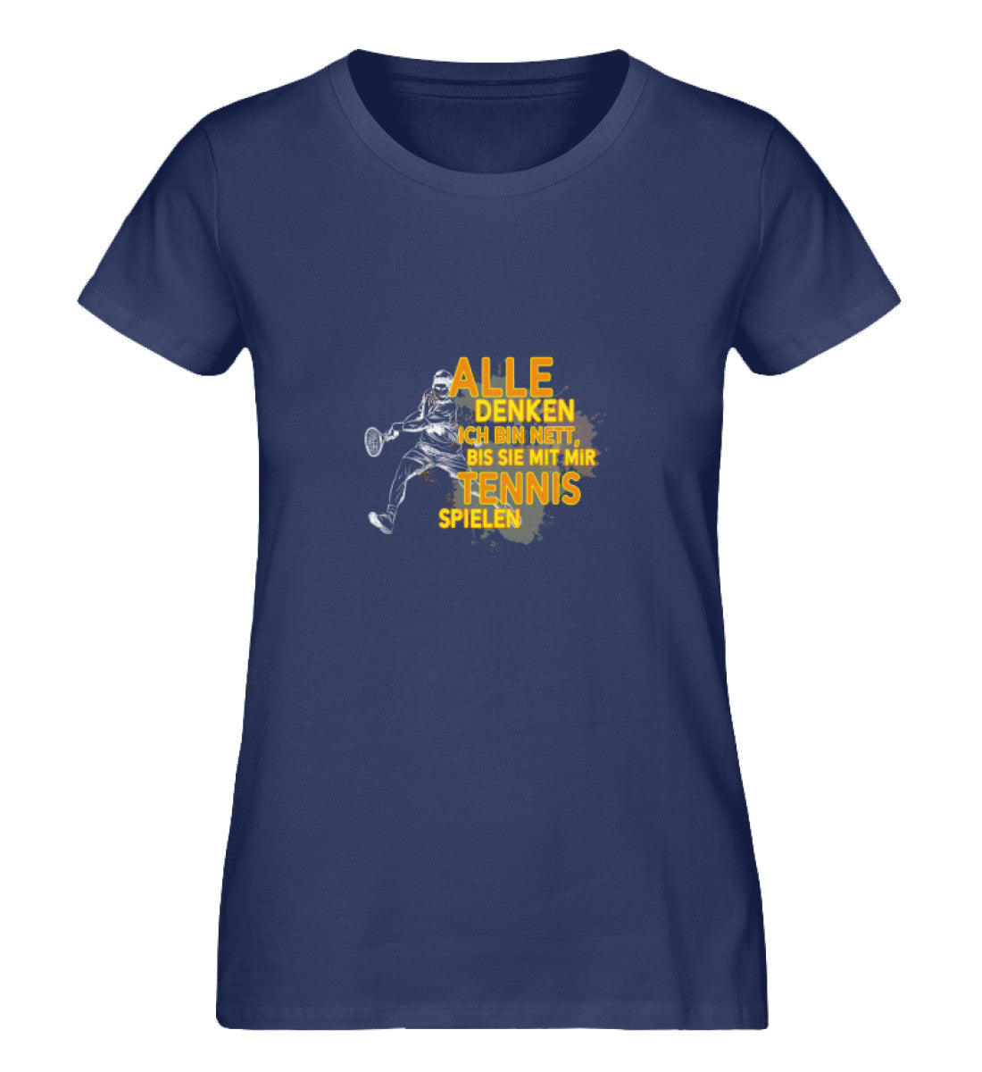 Tauche ein in die Welt des Tennis mit unserem exklusiven Damen T-Shirt: "Alle glauben ich bin nett bis sie mit mir Tennis spielen." Dieses stylische und bequeme T-Shirt ist nicht nur ein Ausdruck deines einzigartigen Humors, sondern auch eine Hommage an deine leidenschaftliche Hingabe zum Tennissport.