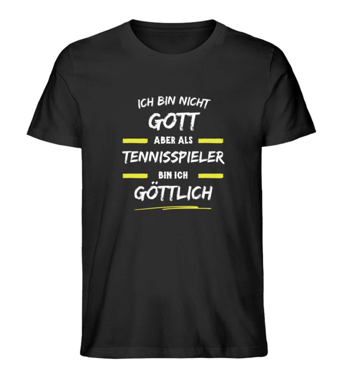 Zeige deine göttlichen Tennisfähigkeiten mit unserem humorvollen T-Shirt! Die Aufschrift "Ich bin nicht Gott, aber als Tennisspieler bin ich göttlich" bringt deine Leidenschaft für den Sport auf den Punkt. Hergestellt aus hochwertiger Baumwolle sorgt dieses Shirt nicht nur für einen coolen Look auf dem Platz, sondern auch für maximalen Komfort beim Spielen. Hol dir jetzt dein göttliches Tennisspieler-Shirt und zeige der Welt, dass du auf dem Platz unübertroffen bist! 🎾✨